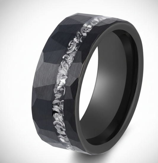 Obsidian Relic Black Tungsten Ring with Crushed Meteorite Inlay
