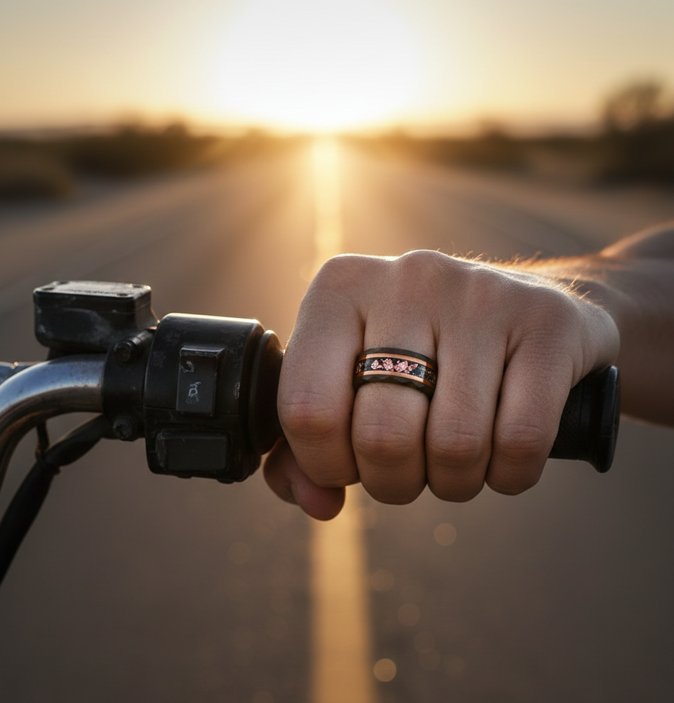 The deep black plated exterior creates a powerful, modern foundation, elegantly contrasted by warm rose gold accents that add refinement and sophistication. At the heart of the band, a striking genuine meteorite inlay—formed beyond Earth—blends seamlessly with shimmering rose gold leaf, creating a breathtaking contrast of raw cosmic texture and refined luxury. Each ring features a naturally unique inlay pattern, making it truly one of a kind.
