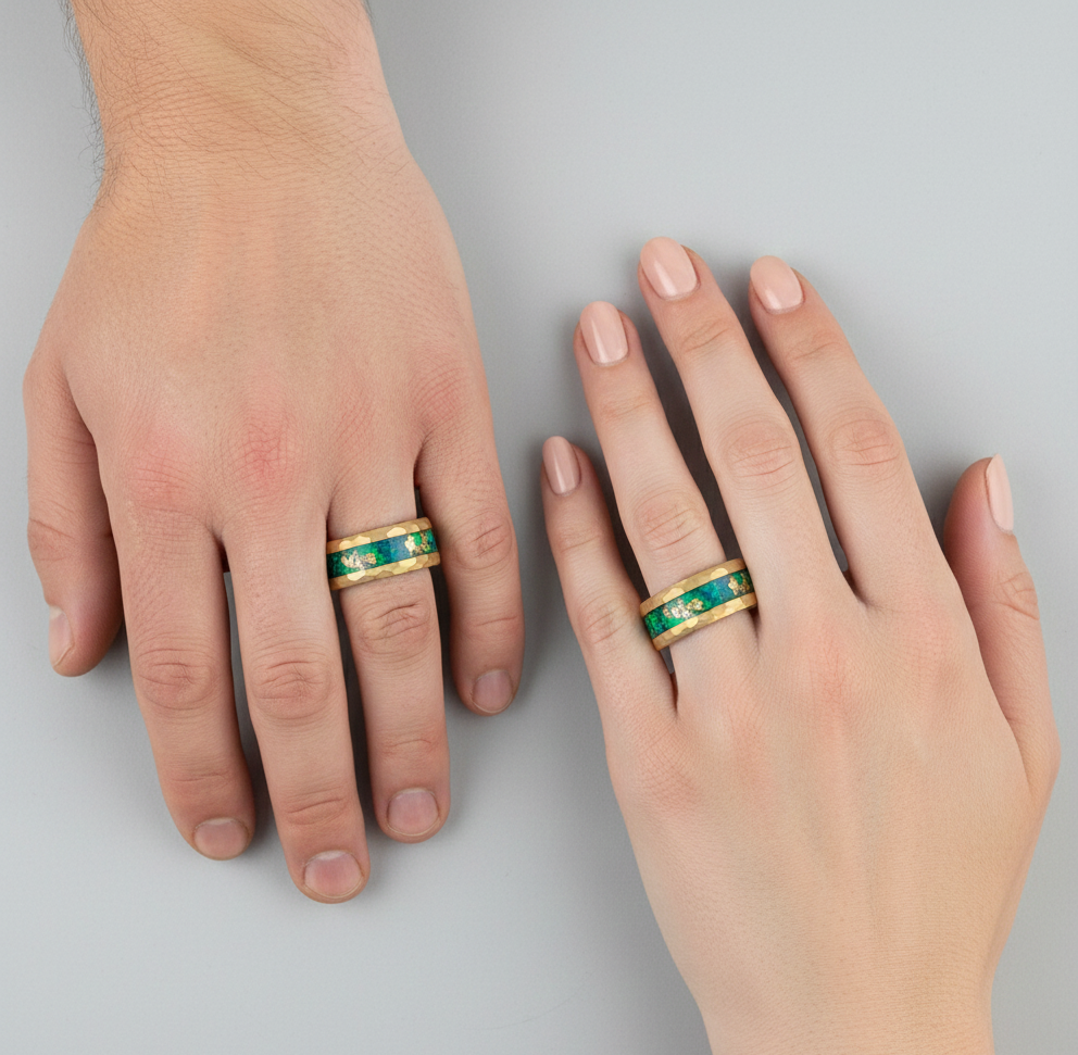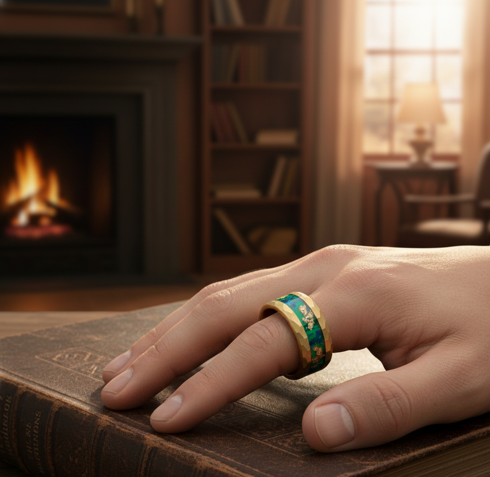 The luminous gold plated exterior delivers a rich, luxurious finish, while the center stone inlay is intricately blended with shimmering gold leaf, creating depth, texture, and a captivating play of light. Each inlay features natural variations, ensuring every ring is truly one of a kind and rich in character.