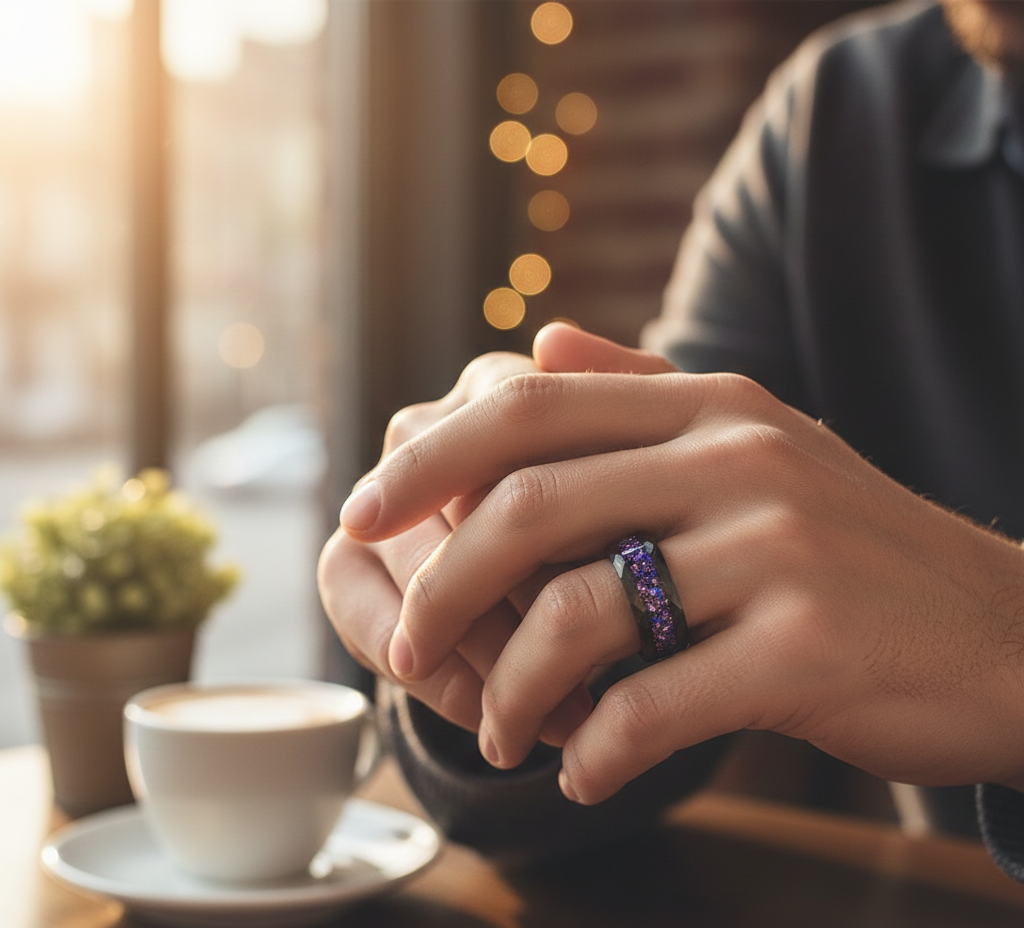 The hammered black plated finish creates a rugged yet refined texture, giving the band a faceted, masculine look inspired by raw obsidian stone. Running through the center, a vivid purple Alexandrite inlay shimmers with dynamic color shifts, reflecting deep violet tones that symbolize royalty, passion, and individuality.
