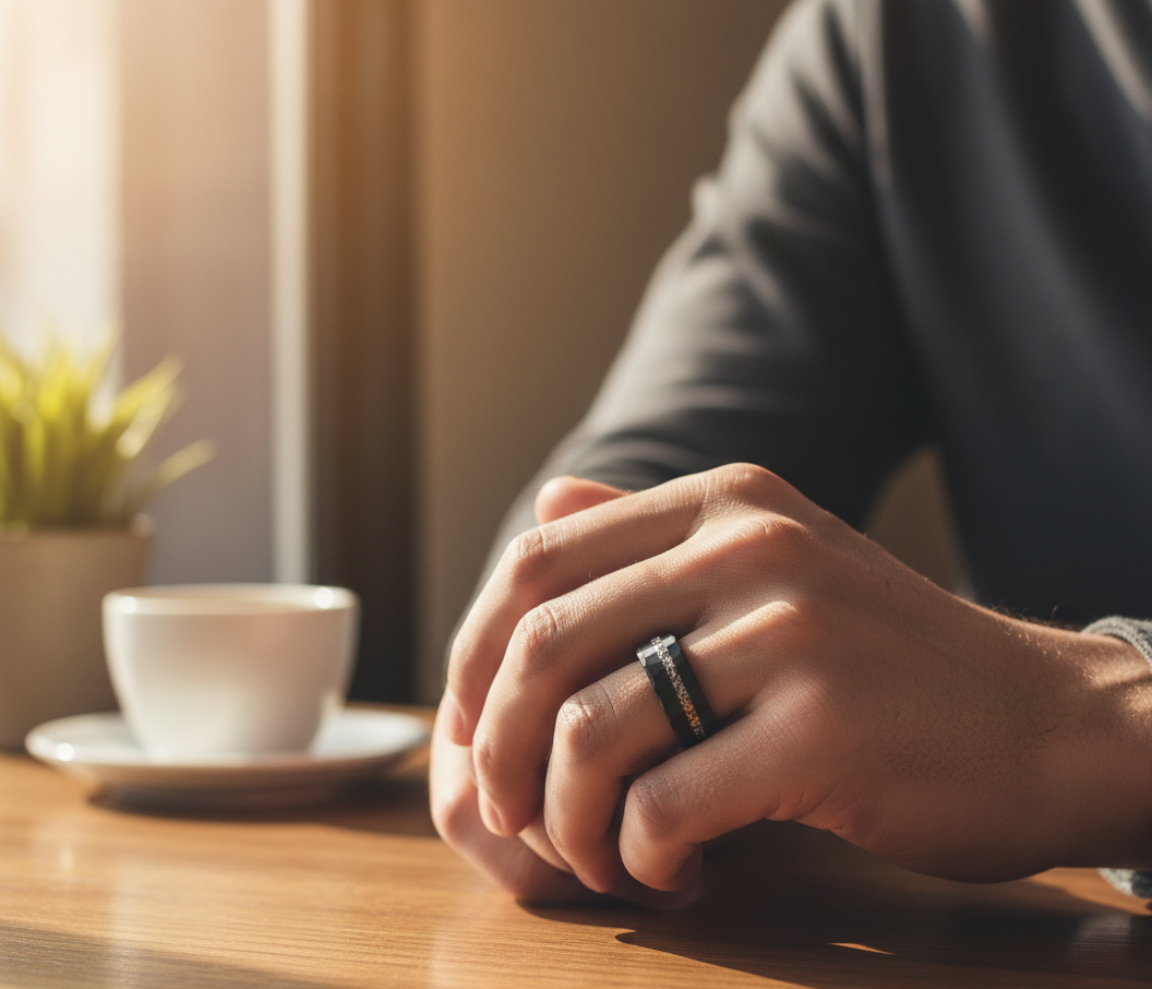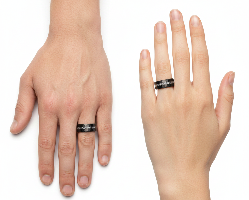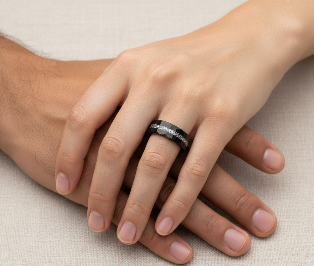 The black plated faceted finish creates a striking geometric texture, giving the band a rugged yet refined appearance inspired by obsidian stone. At the center, a rare crushed meteorite inlay adds a dramatic, organic contrast—formed beyond Earth and carrying a story millions of years in the making. Each inlay pattern is naturally unique, making every ring one of a kind.