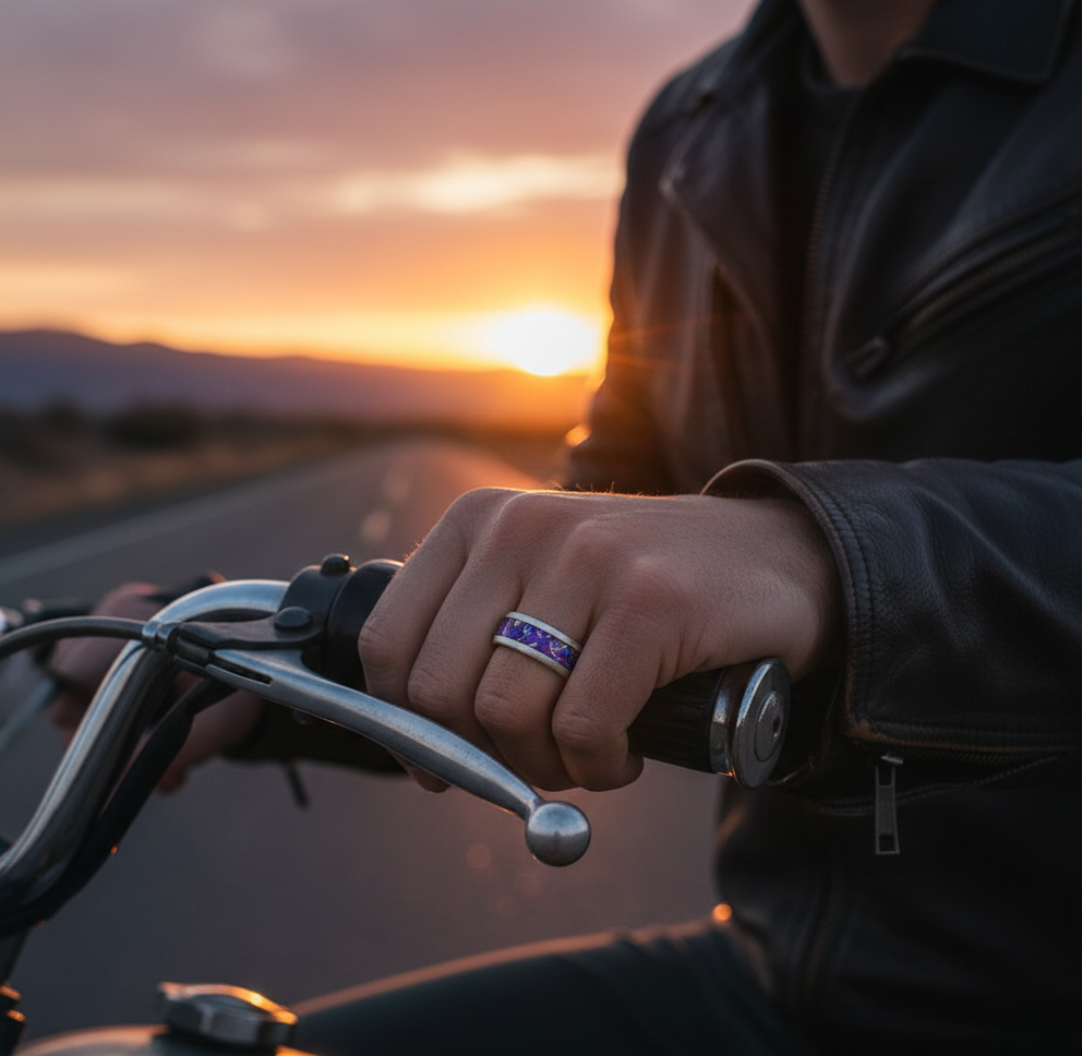 The refined sandblasted silver finish delivers a smooth matte texture with a contemporary industrial feel, creating the perfect backdrop for the vibrant nebula inlay. Swirling with deep blues, purples, and cosmic highlights, the nebula design captures the essence of distant galaxies—each ring uniquely patterned, making every piece truly one of a kind.