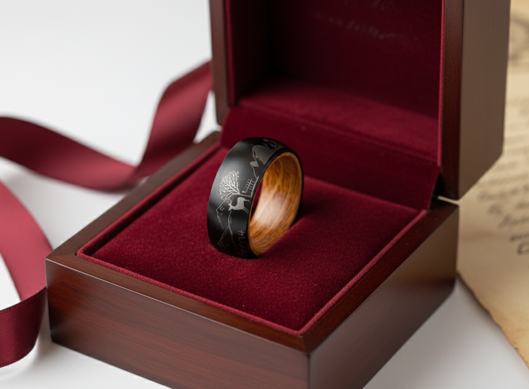 Crafted from premium tungsten carbide, this ring features a genuine whiskey barrel wood liner that brings warmth and natural character to its bold black design. The exterior is intricately engraved with a mountain landscape, featuring a majestic deer and forest trees, symbolizing strength, freedom, and the outdoors. Exceptionally scratch-resistant and built to last, the comfort-fit interior ensures all-day wearability. A timeless statement piece, ideal for everyday wear or meaningful occasions.
